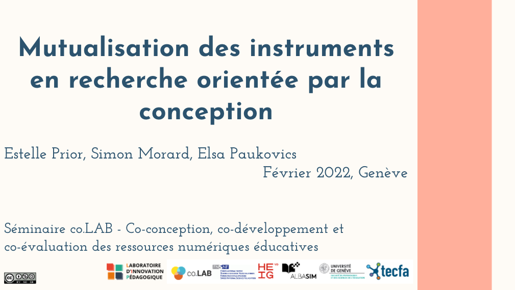 L’équipe MDR (mutualisation Des instRuments), composée de Elsa Paukovics, Simon Morard et Estelle Prior, tou·te·s trois doctorant·e·s au sein du laboratoire d’innovation pédagogique, a présenté ses travaux de recherche lors de la troisième édition du séminaire “Co-conception, co-développement et co-évaluation des ressources numériques éducatives”. Cette édition était consacrée à une réflexion sur les méthodes et outils de la conception collaborative. Le premier intervenant, Jean-Marie Burkhardt (LaPEA, Université Gustave Eiffel) a présenté un cadre d’analyse de la co-conception. L’équipe MDR, quant à elle, a présenté un modèle visant la caractérisation et la formalisation d’instruments mobilisés dans le cadre de recherches menées en recherche orientée par la conception.